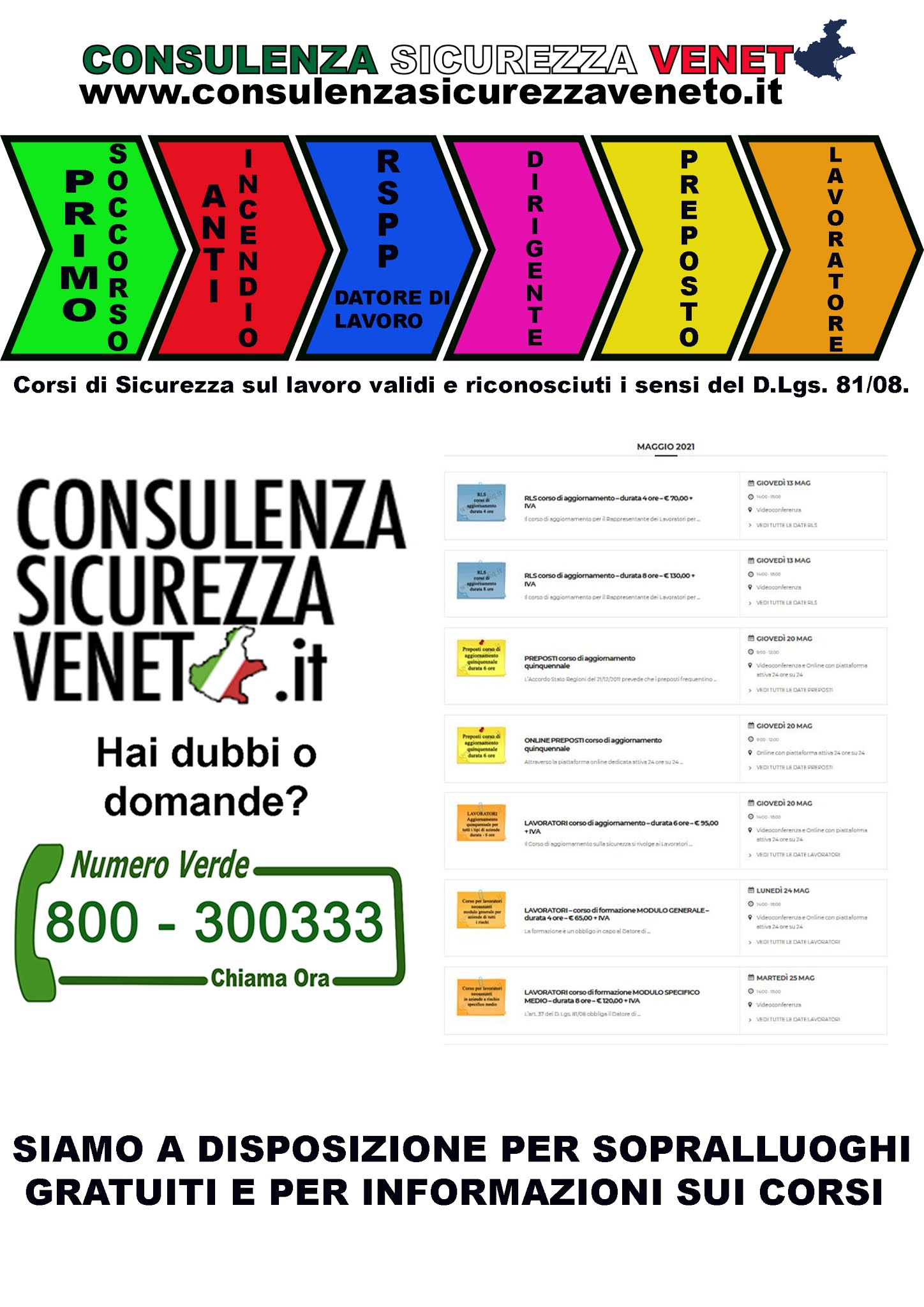 Per il mese di maggio 2021 abbiamo in programma corsi in videoconferenza con prova pratica in presenza per la formazione di nuovi addetti alle squadre di emergenza per la lotta antincendio e primo soccorso.